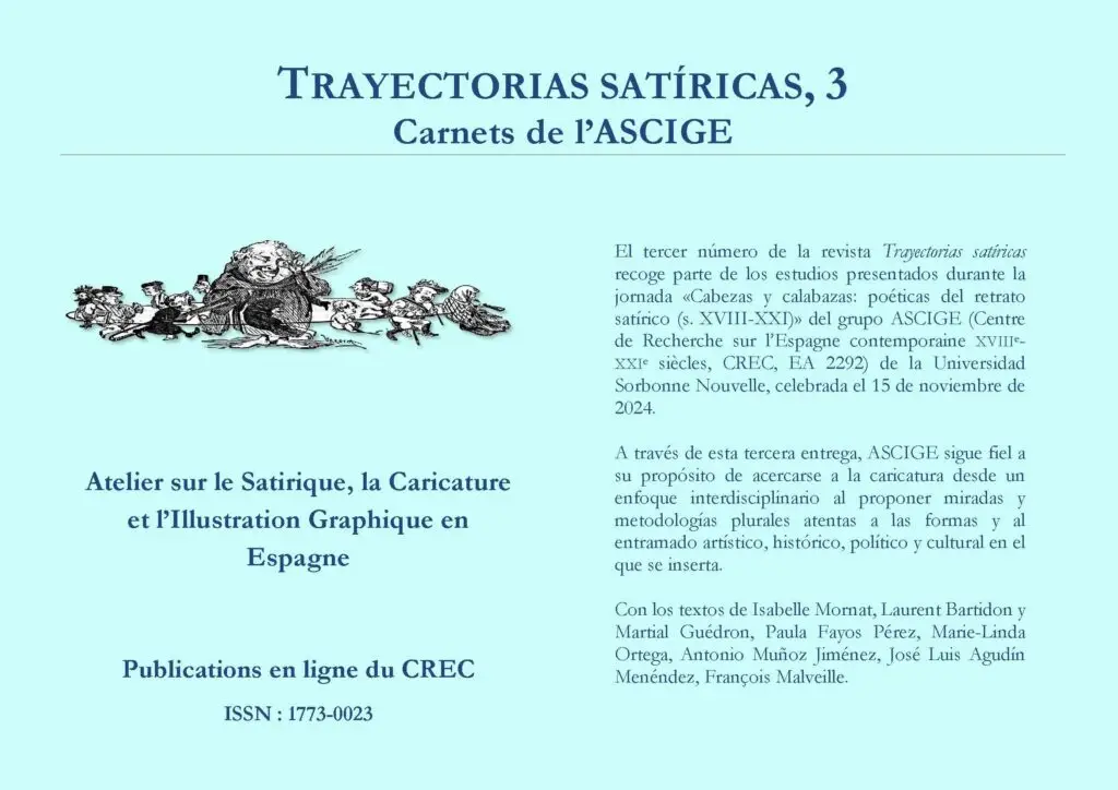 Depuis 2018, l’ASCIGE publie la revue Trayectorias Satíricas (resp. Isabelle Mornat), diffusant des études sur le satirique et la caricature, et qui réunit notamment les travaux issus du séminaire ou des Journées d’études de l’atelier.